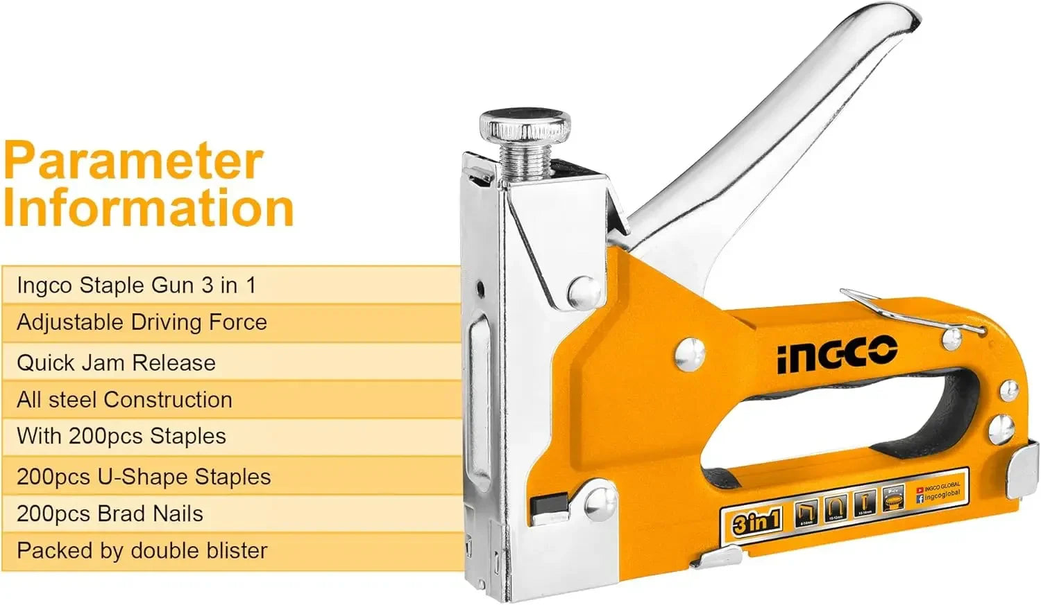 - 3 in 1 staple gun Adjustable driving force Staples:Wire:1.2mm,Crown:11.3mm,Leng th:4-14mm U-Shape Staples :Wire:1.2mm,Crown:6.3mm,Length:10- 12mm Brad Nails:Wire:1.2mm,Length:4-14mm With 200pcs Staples/200pcs U-Shape