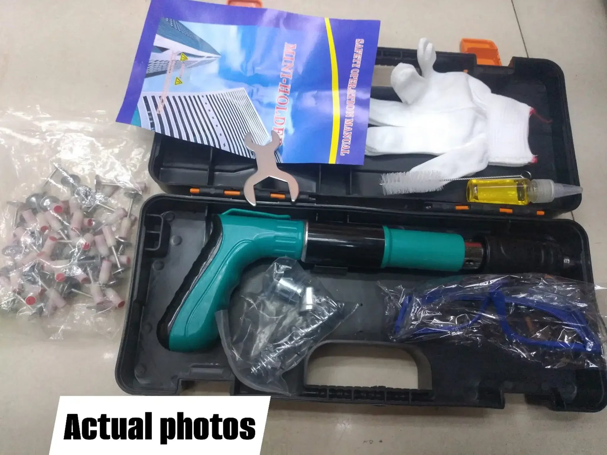 2. Small and Convenient. Light weight, small size, can be operated with one hand, equipped with a plastic box, easy to carry the machine and nails.